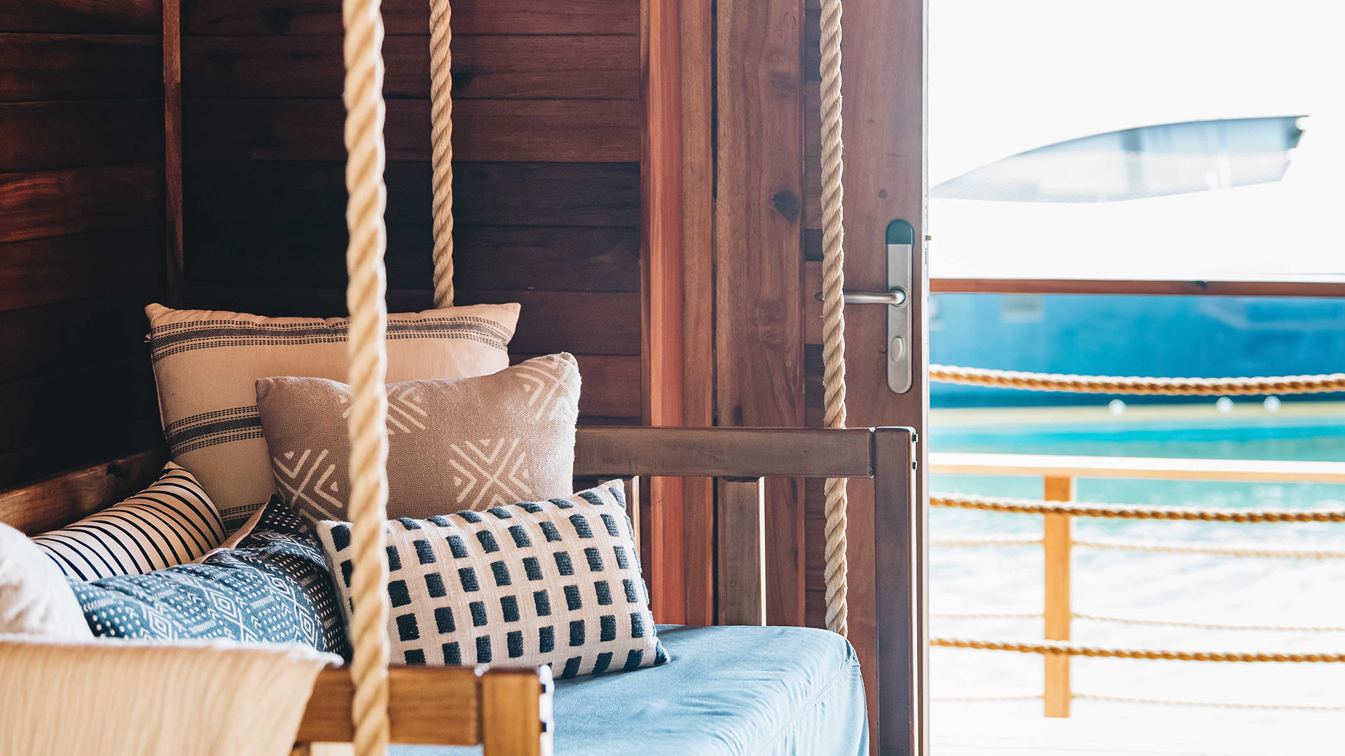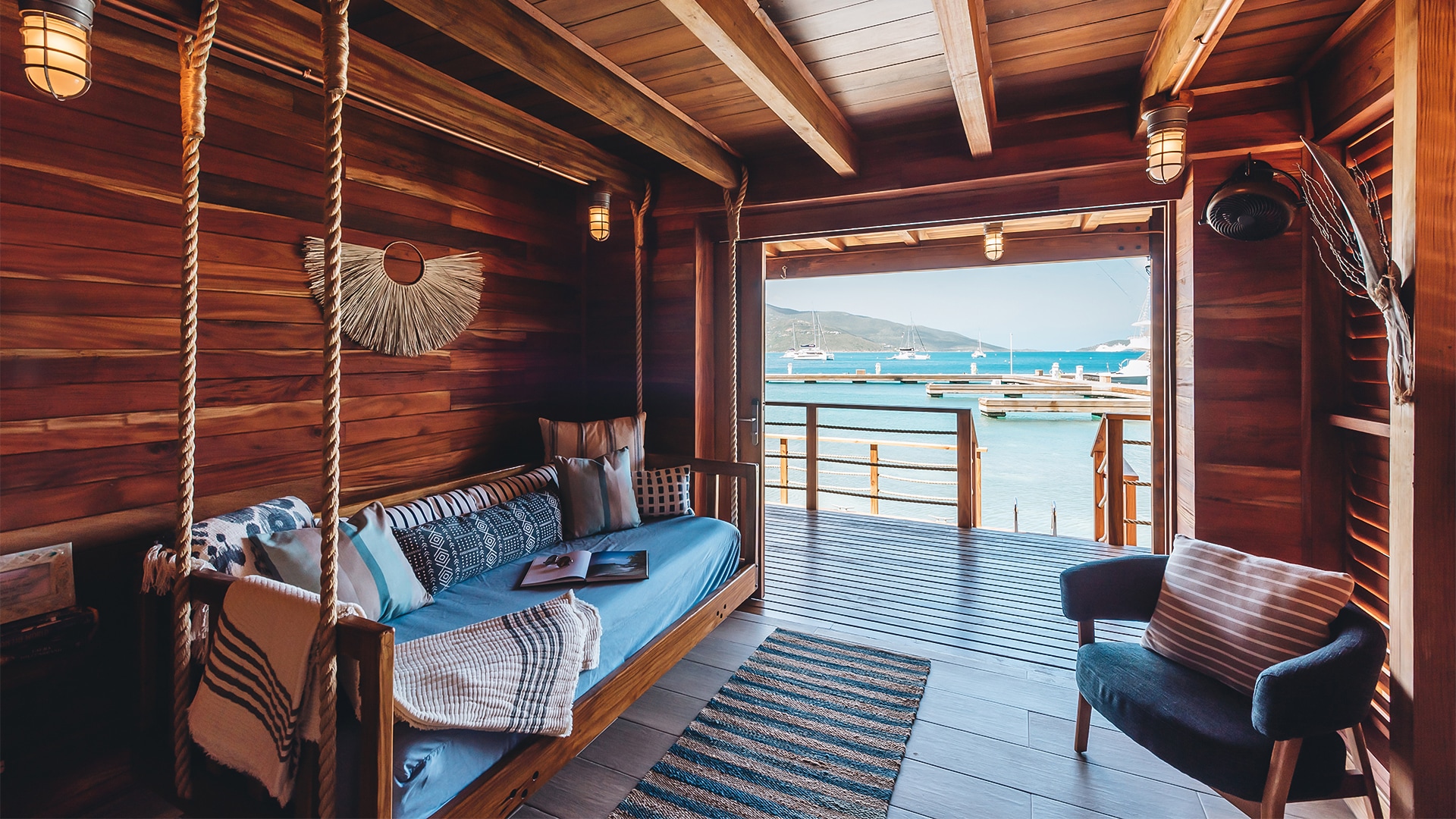 a room with a swing and a boat in the water